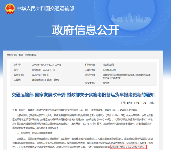 为加快推动交通运输绿色低碳发展而设立的“老旧营运货车报废更新补贴政策”,其申请窗口将在2025年12月31日正式关闭。这意味着,针对国三、国四排放标准营运货车的专项补贴政策,仅剩最后数日的申请时间。