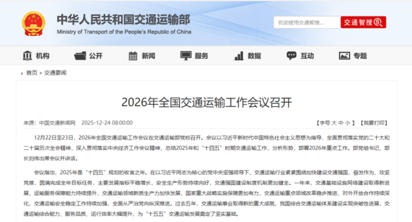 会议指出,2025年是“十四五”规划的收官之年。在以习近平同志为核心的党中央坚强领导下,交通运输行业紧紧围绕加快建设交通强国,奋发作为、攻坚克难,圆满完成全年目标任务,主要发展指标平稳增长,安全生产形势持续向好,交通强国建设制度机制更加健全。一年来,交通基础设施网络建设取得新进展,运输服务保障能力持续提升,交通运输领域新质生产力加快发展,国家重大战略实施保障更加有力,交通运输重点领域改革稳步推进,对外开放合作持续深化,交通运输安全稳定工作持续加强,全面从严治党向纵深推进。过去五年,交通运输事业取得新的重大成就,我国综合交通运输体系建设实现突破性进展,交通运输综合能力、服务品质、运行效率大幅提升,为“十五五”交通运输发展奠定了坚实基础。 会议强调,要全面贯彻落实党的二十届四中全会精神,准确把握“十五五”时期交通运输发展的阶段性特点,深刻认识“三个转向”,即综合交通运输体系建设的推进方式由分方式成网的综合性推进转向跨区域统筹布局、跨方式一体衔接、跨领域深度融合推进,发展动能由主要依靠要素驱动转向依靠结构优化、数智赋能、绿色转型协同驱动,增长模式由大规模增量扩张转向以做优增量、提质存量为主导的内涵式发展。要把完善现代化综合交通运输体系作为“十五五”时期的主攻方向,重点抓好“一网四化”,即加快建设便捷顺畅、经济高效、绿色集约、智能先进、安全可靠的现代化高质量国家综合立体交通网,突出一体化融合、安全化提升、数智化升级、绿色化转型。要准确把握“十五五”时期的重点任务,完善基础设施布局,优化交通运输结构,增强基础支撑功能,培育高质量发展新动能,提升安全韧性水平,提高行业治理效能。